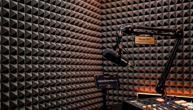 Cotizar Evento →Producción broadcast con Shure MV7 y set multicámara en estudio climatizado.